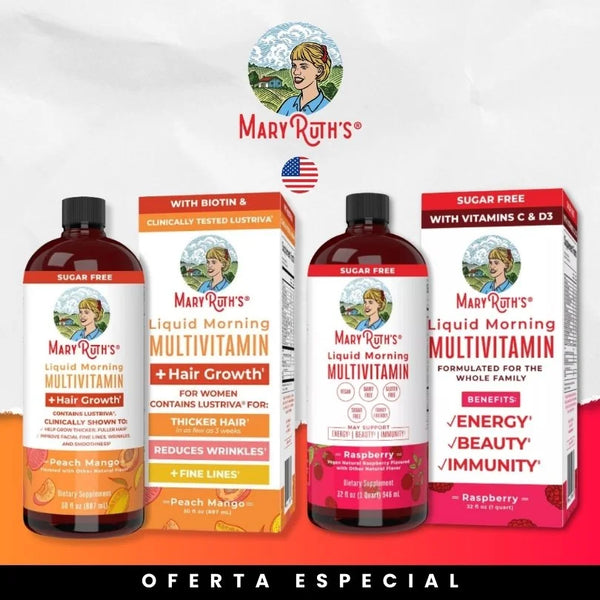Un MaryRuth's® Hair Growth Peach Mango, el cual potencia la salud de tus folículos capilares y estimula el crecimiento del cabello y un MaryRuth's® Liquid Morning Multivitamin frutos rojos, rico en vitaminas y minerales esenciales para la salud general y crecimiento capilar.